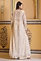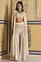 Featuring an ivory long jacket in net base with hand embroidery. It is paired with a dupion embroidered bralette and net embroidered sharara pants. Accentuate it with zircon or swarovski jewellery and embellished heels for your sangeet or wedding ceremony.