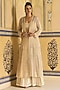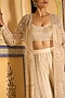 Featuring an ivory jacket in net base with pearl and cutdana hand embroidery. It is paired with net embroidered sharara pants and a dupion bustier. Accentuate it with zircon or swarovski jewellery and embellished heels for a wedding or sangeet ceremony.