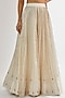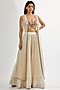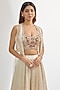 Featuring an ivory cape in upada and organza base. It is paired with matching sharara pants and a bustier.