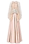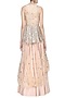 This set features a nude peplum jacket in dupion silk base with sequinned hem and floral work on the front and back. It is paired with matching dutchess silk plain skirt.