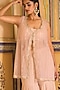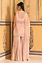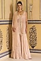 Featuring a pink sleeveless jacket in net base with scalloped borders and embroidery. It is paired with chiffon pearl embellished sharara pants, a dupion bustier and a chiffon stole. Accentuate it with zircon or swarovski jewellery and embellished heels for your wedding or sangeet ceremony.