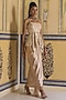 Featuring a pink peplum top in net base with glass pipe embroidery and noodle straps. It is paired with a satin draped mermaid skirt. Accentuate it with kundan polki or zircon jewellery and embellished heels for your wedding or sangeet ceremony.