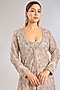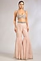 Featuring a powder pink jacket in tulle base. It is paired with a silk dupion blouse and silk organza sharara pants. Accentuate it with zircon jewellery and heels for a festive occasion, wedding, engagement or sangeet ceremony.