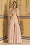 Featuring a taupe jacket in net base with hand embroidery. It is paired with a dupion bustier and net embroidered sharara pants. Accentuate it with zircon or swarovski jewellery and embellished heels for a wedding or sangeet ceremony.