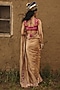 Featuring an antique gold saree in tissue base with resham and floral boota thread embroidery. Accentuate it with a blouse, statement jewellery, block heels and a potli bag, perfect for festive occasions, sangeet or cocktail ceremony.