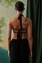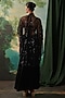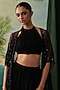 Featuring a black scalloped cape in organza base with sequins and beads hand embroidery. It is paired with a georgette blouse having a halter neckline and georgette sharara pants. Accentuate it with dangler earrings and heels for a festive occasion or sangeet ceremony.