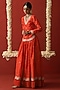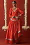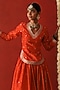 Featuring a sindoori orange lehenga in brocade silk base with gota, marodi, beads and thread hand embroidery. It is paired with a blouse. Accentuate it with polki jewellery and heels for a wedding or sangeet ceremony.
