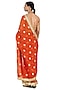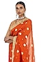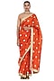 Featuring an orange saree in organza base with peacock bootas. It's border is lined with gota and kiran. This timeless piece is ideal for various occassions and easy to style with different accessories.
