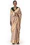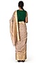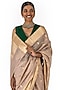 Featuring a pale pink saree in tissue silk base, woven with gold zari. It has horizontal gold stripes with punctuated with green meenakari and a bold gold border and dense palla. This timeless piece is ideal for various occasions and is easy to style with different accessories.