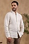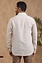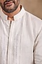 Featuring a beige shirt in pure linen base with a striped yoke, kantha hand stitch details and a mandarin collar.