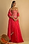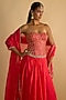 Featuring a crimson red lehenga in silk chiffon base. It is paired with a hand embroidered corset and an organza dupatta. Style this set with soft waves and minimal jewelry, perfect for a wedding, sangeet or engagement ceremony.