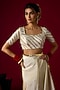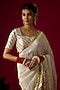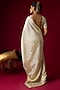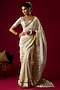 Featuring a gold saree in silk tissue base with lumpi border detail and banarasi strips. It is paired with a banarasi striped blouse having sequins embellishments, including a satin underskirt. Accentuate with polki jewellery and block heels for sangeet ceremonies or weddings.