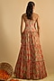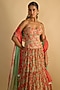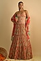 Featuring a green and orange gathered lehenga in georgette base with floral print. It is paired with a printed corset blouse having hand embroidery and a shaded organza dupatta. Style this set with soft waves and minimal jewelry, perfect for a wedding, sangeet or engagement ceremony.