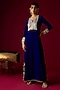 Featuring a royal blue kaftan in velvet base with gold machine embroidery and coin embellishments. Accentuate with gold jewellery and block heels for festive ceremonies.