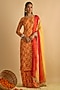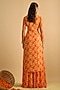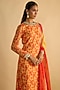 Featuring a yellow and orange kurta in georgette base with floral print and hand embroidery. It is paired with pants and an organza dupatta. Style this set with soft waves and minimal jewelry, perfect for festive occasion, haldi or sangeet ceremony.