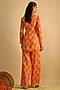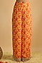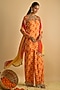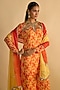 Featuring a yellow and orange short kurta in georgette base with a scalloped neckline, floral print and hand embroidery. It is paired with palazzo pants and an organza dupatta having a chitta work. Style this set with soft waves and minimal jewelry, perfect for festive occasion, haldi or sangeet ceremony.
