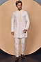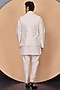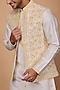 Featuring a beige bundi jacket in chiffon base with resham, bead and tikki work. It is paired with a white kurta and alighadi pants. Perfect wear for festive occasions.