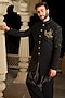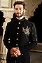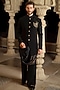 Featuring a black indowestern in imported fabric base with deer metallic embroidery. It is paired with a cowl kurta and pants. Style it with pair of mojaris for a wedding, sangeet or engagement ceremony.