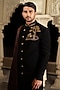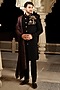 Featuring a black indowestern in imported fabric base with zardosi embroidery. It is paired with a dupatta and trousers. Style it with pair of mojaris for a wedding, sangeet or engagement ceremony.