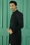 Featuring a black indo-western jacket in imported suiting fabric base with kashmiri floral embroidery and collar buttons detail. It is paired with an inner jacket and trousers. Perfect attire for a wedding or an engagement ceremonies.