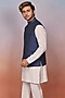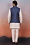 Featuring a blue bundi jacket in silk base. It is paired with a linen kurta and alighadi pants. Perfect wear for festive occasions.