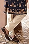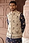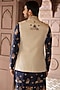 Featuring a gold bundi jacket in tissue base with motif handwork. It is paired with a navy blue banarasi silk kurta and trousers. Style it with pair of mojaris for a festive occasion, wedding or engagement ceremony.