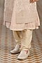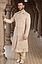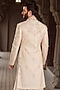 Featuring a gold sherwani in tissue base with kora work. It is paired with a kurta and aligarhi pants. Style it with pair of mojaris for a wedding or engagement ceremony.