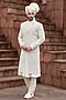 Featuring a gold sherwani in tissue base with kora and resham embroidery. It is paired with a kurta and aligarhi pants. Style it with pair of mojaris for a wedding or engagement ceremony.