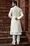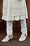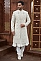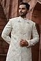 Featuring a light gold sherwani in silk base with zardosi and cutdana embroidery. It is paired with a kurta and aligarhi pants. Style it with pair of mojaris for a wedding or engagement ceremony.