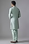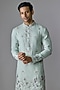 Featuring a mint green kurta in imported fabric base with thread and pearl embroidery. It is paired with aligarhi pants. Style it with loafers for a reception, evening celebration, wedding or engagement ceremony.