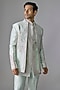 Featuring a mint green indowestern jacket in silk base with sequins, french knot, stone and pearl embroidery. It is paired with a kurta and pants. Accentuate it with classic mojaris and a sleek watch for a refined, modern look, ideal for weddings, receptions, or grand festive celebrations.