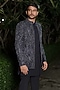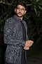 Featuring a navy blue indowestern in imported fabric base with geometric cutwork and metallic embroidery. It is paired with a kurta and trousers. Style it with pair of mojaris for a reception, wedding, sangeet or engagement ceremony.