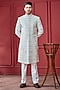 Featuring an off-white sherwani in silk base with thread and geometric floral resham work. It is paired with a kurta and churidar. Style it with mojaris, for a wedding or engagement ceremony, exuding charm and elegance.