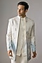 Featuring a white and blue indowestern jacket in silk base with sequins, french knot, cutdana and thread embroidery. It is paired with a kurta and pants. Accentuate it with classic mojaris and a sleek watch for a refined, modern look, ideal for weddings, receptions, or grand festive celebrations.