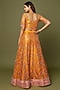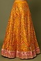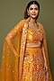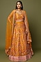 Featuring a mustard yellow lehenga in net base with mirror, zari, and thread embroidery. It is paired with a matching embroidered blouse and a dupatta.