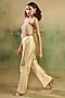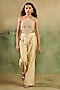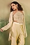Featuring a beige structured jacket in chanderi base with gold embellishments. It is paired with an embellished corset and pants. Accentuate it with dangler earrings and block heels for a festive occasion or pooja ceremony.