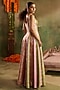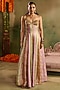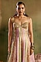 Featuring a multi-colored kalidar gown in banarasi silk base with an attached golden bustier and noodle straps. Style it with statement earrings, soft curls and block heels, perfect for a cocktail, engagement or sangeet ceremony.