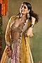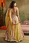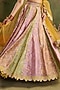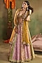 Featuring a multi-colored kalidar lehenga in chanderi banarasi base with a scalloped cutwork border. It is paired with a golden blouse and a sheer organza dupatta. Style it with statement earrings, soft curls and block heels, perfect for a wedding, engagement or haldi ceremony.