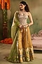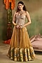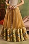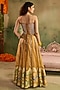 Featuring yellow sharara pants in chanderi banarasi base. It is paired with a golden shimmer corset. Style it with statement earrings, soft curls and block heels, perfect for a festive, engagement or haldi ceremony.