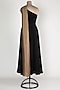 Featuring a black one shoulder gown in crepe base with golden drape.
