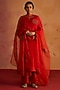 Featuring a red kurta in pure silk base with thread and zardosi hand embroidery. It is paired with pure silk pants and an organza dupatta. Accentuate it with statement earrings and heels for festive look.