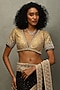 Ri Ritu Kumar features a mesmerizing Black & Gold Saree Set that captivates with its elegance. The eye-catching saree is crafted in silk brocade with zardosi hand embroidery. It is paired with a silk unstitched blouse. Accentuate the designer saree set with soft curls, kundan polki or zircon jewellery, embellished heels and a potli bag for a traditional bridal look. Perfect wear for sangeet nights or festive parties.