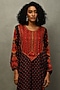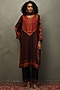 Ri Ritu Kumar presents a black and multi-colored kurta in silk satin base with hand and machine embroidery, including geometric print. It is paired with rayon crepe palazzo pants and a viscose chinon dupatta. Accentuate it with statement jewellery and heels for festive occasions or pre-wedding ceremonies.