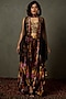 Featuring a black cape in polyester base. It is paired with matching viscose pants having multi-colored floral print and an embroidered blouse.