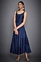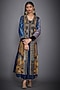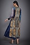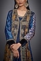 Featuring a navy blue dress in silk and velvet base with zardosi hand embroidery. It is paired with a contrasting ochre jacket.