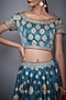 Featuring a blue lehenga skirt in silk satin base with print and floral motif embroidery. It is paired with a matching blouse and sheer dupatta.