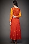 Featuring a bright orange and yellow kurta in viscose cotton georgette base with machine and hand embroidery including geometric floral print. It is paired with matching viscose lycra churidar pants and a cotton silk dupatta.