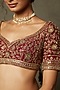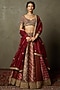 Featuring a burgundy lehenga in shikarga brocade base with embroidery. It is paired with a matching silk dupion blouse and silk organza dupatta.