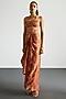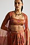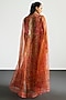 Ri Ritu Kumar presents a coral and multi-colored cape in silk organza base. It is paired with a bustier and a silk satin skirt. Accentuate it with dangler earrings and heels for a sangeet ceremony.
