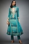 Ri Ritu Kumar presents an emerald green kurta in rayon crepe base with hand embroidery and geometric print. It is paired with viscose satin lycra pants and a viscose chiffon dupatta. Accentuate it with statement jewellery and heels for festive occasions or weddings.